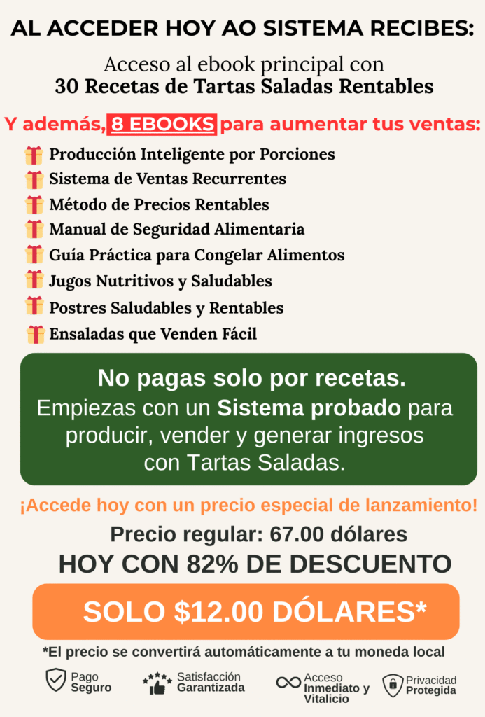 Recibirás 20 recetas de tartas salada Tradicionales e Gourmet, además de 10 recetas sin gluten. Aprenderás recetas paso a paso y listas de ingredientes.