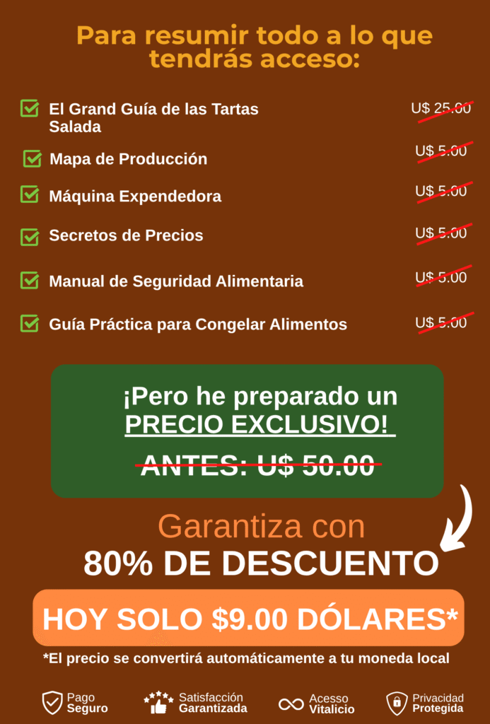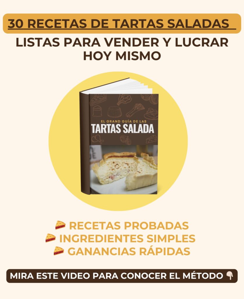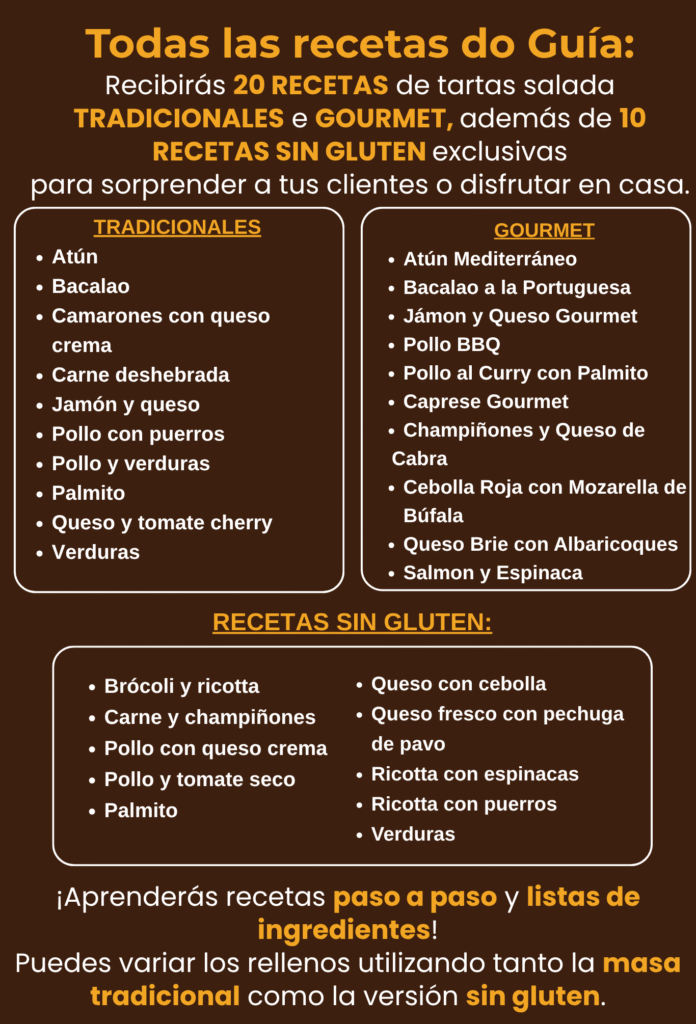 Recibirás 20 recetas de tartas salada Tradicionales e Gourmet, además de 10 recetas sin gluten. Aprenderás recetas paso a paso y listas de ingredientes.